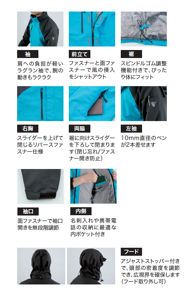 二重前立て・裾スピンドルゴムで風を防ぎます。取り外しできるフードはサイドの視界を広げるアジャスター付きです。