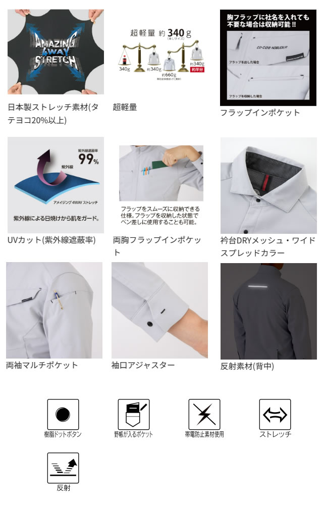 重さが従来のTC素材の約半分!超軽量シリーズ。伸長率タテ・ヨコ20%以上のストレッチ素材でノンストレスな着用感。オールシーズン対応素材を使用しました。SS、Sサイズは女性対応シルエットです