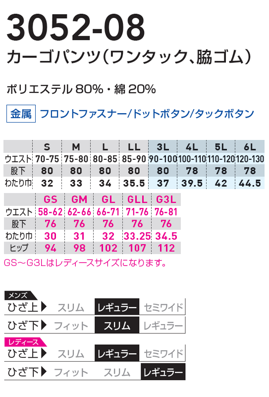 SOWA3052-08 カーゴパンツ(ワンタック、脇ゴム)