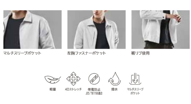 JIS T8118規格適合の静電気帯電防止作業服です。全方位にのびるストレッチ性で動きやすいスウィングトップ型作業ブルゾンです。