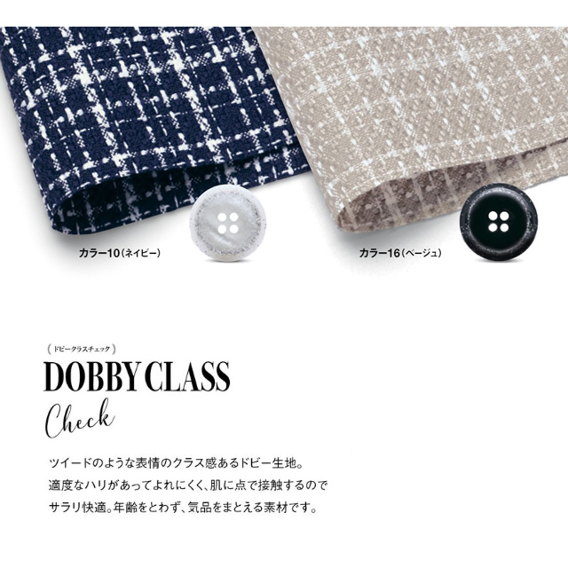 ツイード調の華やぎで佇まいに品格と優しさを。ドビーチェックの格子が織りなす気品あふれる表情が魅力。素材の美しさを活かした丁寧な仕立てでワンランク上のお仕事を目指せるシリーズです。洗濯機で洗えます。