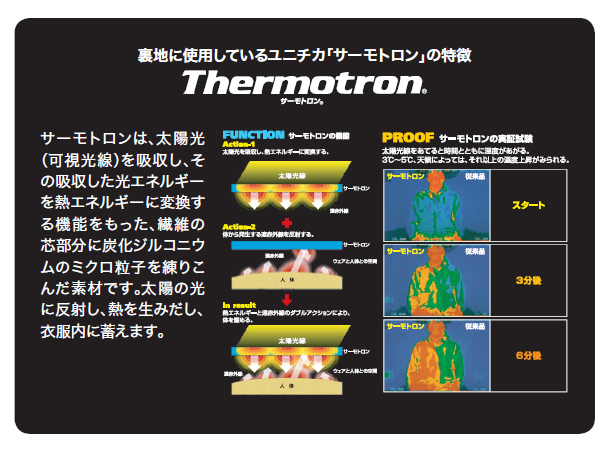 ハーフコート丈の軽防寒。蓄熱+中綿で保温性アップ。太陽光を熱に変えるサーモトロンが衣服内を暖めます。襟・袖口、身ごろ裏にあたたかいフリース生地を使用しました。