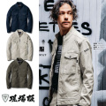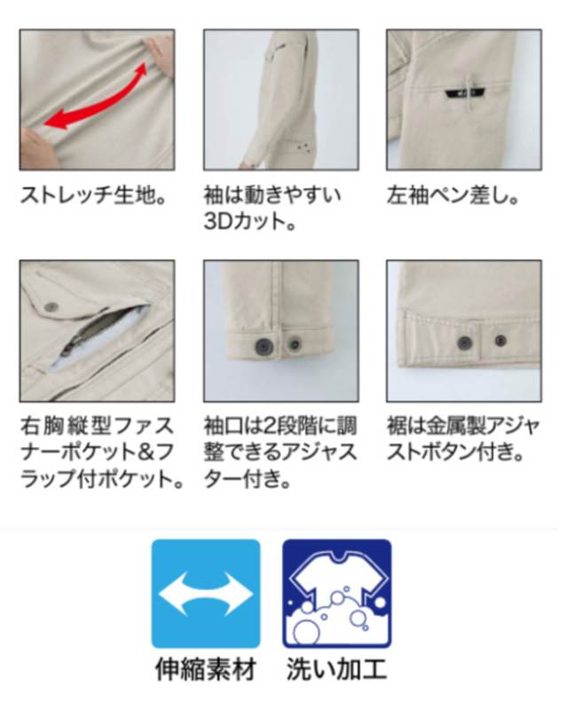 ドビー織で凹凸のある素材に、洗い加工を施すことでユーズド感をだし、ハードな印象に。のびのびストレッチで動きやすい現場服です。