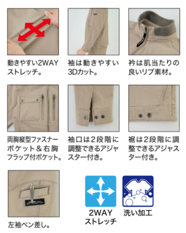 2WAYストレッチスラブツイル現場服です。スラブ糸使いでカジュアル感のある素材と肉厚で丈夫な生地感はハードな現場に最適です。