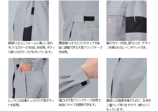 腰にはウエストサイズを調節できる大型マジックテープを採用しました。袖口にもマジックテープ採用でサイズ調節できます。