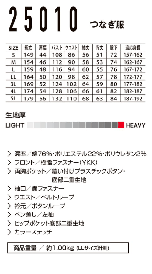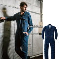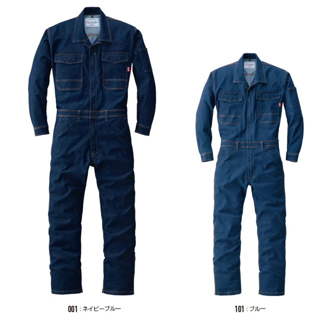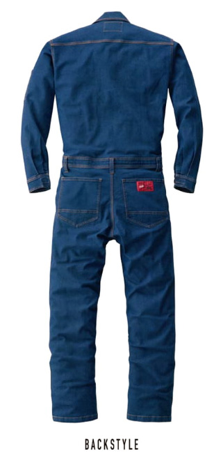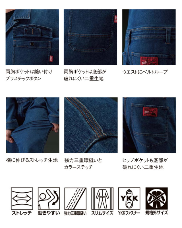 スリムなシルエットのストレッチデニムつなぎ服です。ボタン留めの胸ポケットフラップ、底部が二重生地で破れにくいポケットや強力三重環縫い、ウエスト部にはベルトを通せるベルトループも装備。生地やシルエットだけでなく、機能性とこだわりのアイデアが盛り込まれたつなぎ服です。