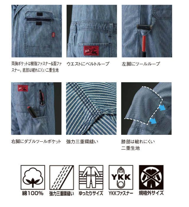 ビンテージな雰囲気を持つカジュアルヒッコリーストライプつなぎ服。ゆったりとしたシルエットにベルトループ、ツールループ、工具を収納するのに便利なツールポケットを装備。膝部を二重生地にするなど膝つき作業でも破れにくい工夫が施されており、様々なシーンで着用したくなるつなぎ服です。