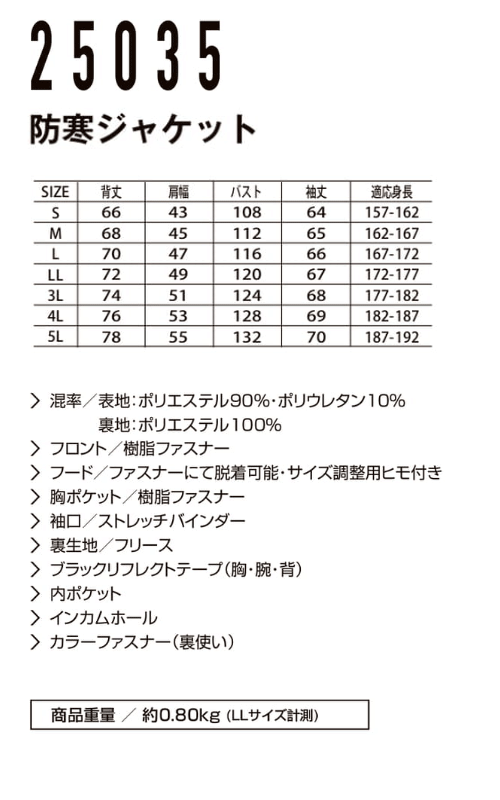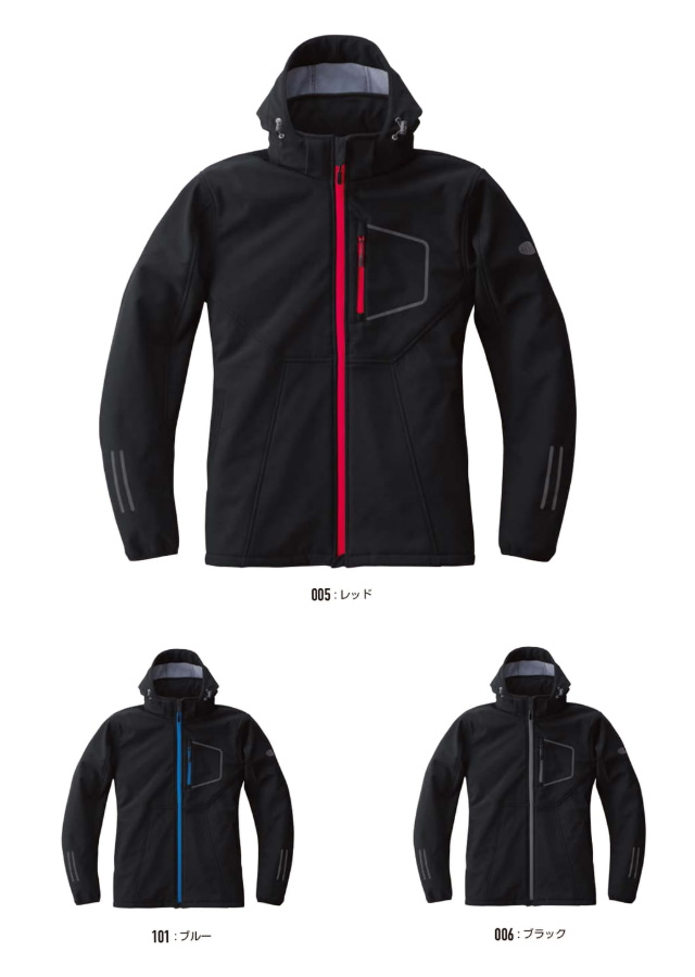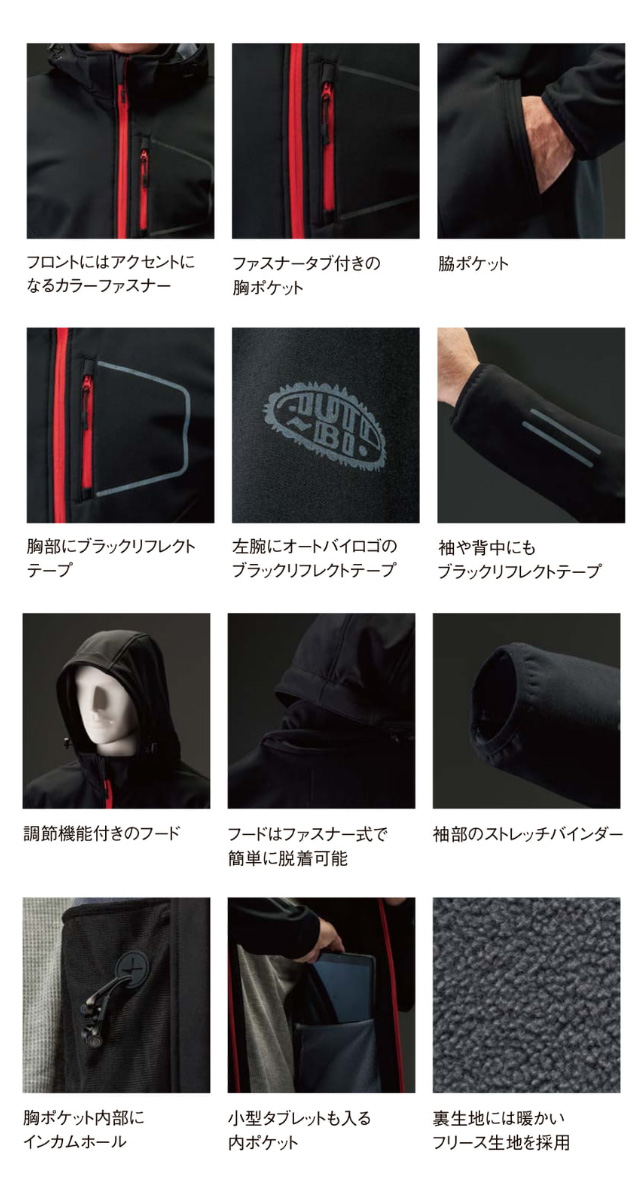 シンプルなブラックのボディにファスナーのカラーラインがアクセントのソフトシェルジャケットです。取り外し簡単なフードやインナーのフリース生地などの防寒性能の他にも便利で安全に寄与する機能を多数搭載しました。