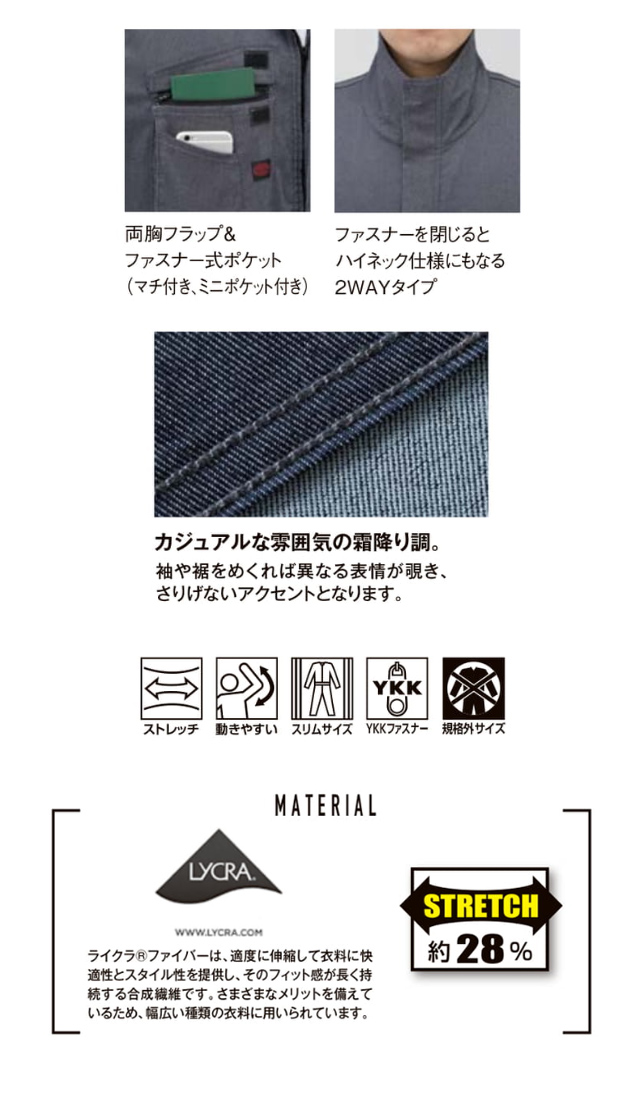 細身のシルエットなのに働く身体に心地よくフィットする優れたストレッチ性能を持つ「LYCRA」を採用した抜群のフィット感を持つ、つなぎ服です。